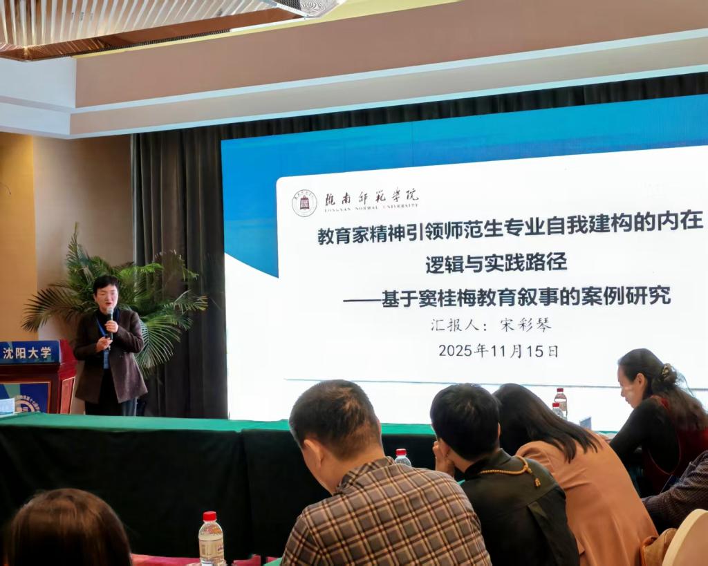 宋彩琴在专题分论坛作题为《教育家精神引领师范生专业自我建构的内在逻辑与实践路径 —— 基于窦桂梅教育叙事的案例研究》的专题报告。报告立足教育家精神的核心内涵,结合窦桂梅教育叙事典型案例,系统剖析了师范生专业自我建构的内在机理,提出了兼具理论深度与实践价值的培养路径。报告后,宋院长与来自各地院校的同仁围绕报告核心内容展开热烈探讨,交换实践经验。此外,唐作莉在专题论坛中以《教育家精神引领师范生自我身份认同的机制与路径研究》为题,围绕师范生身份认同的建构过程、现实挑战及培养策略等关键问题,与同行交流实践经验。
